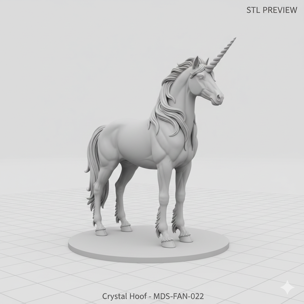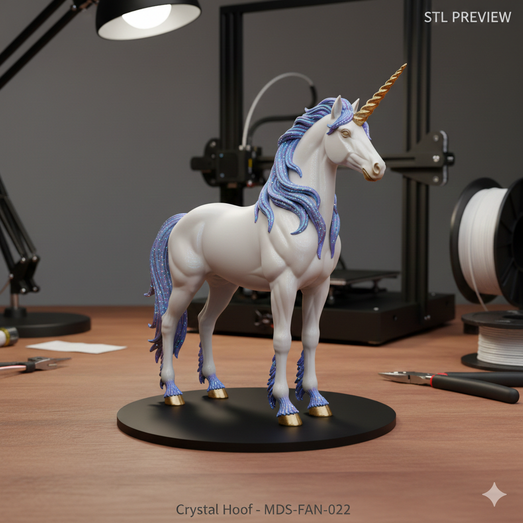 „Crystal Hoof“ ist ein elegantes Einhorn mit fließender Mähne und dekorativem Sockel. Das Modell eignet sich perfekt als Fantasie-Deko oder Geschenkidee.
